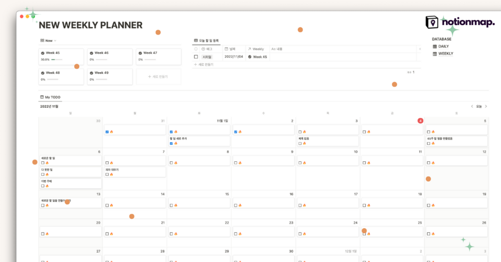 - 주간 플래너를 사용하여 매주 월요일마다 새로운 할 일을 등록하고 연관 관계를 설정하여 캘린더에 반영했습니다. 이를 통해 매일 완료율을 확인하며 꾸준히 목표를 달성하고 있습니다.